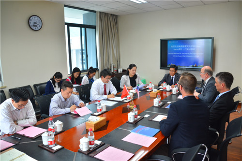 德雷克大学校董会成员葛雷格·江森先生、中国项目主任卡尔·马丁先生,我校国际合作与交流处副处长马驭骅、项目主管邱晓凤,新闻传播学院副院长郭赫男、国际合作办公室主任蓝若宇,外国语文中心张涛教授出席本次会谈。翻译学院张鹏教授担任翻译。