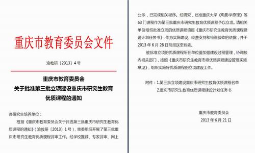 月重庆市教委在全市研究生培养单位中开展了第三批立项建设的重庆市研究生教育优质课程的申报工作。我校高度重视,由分管校长牵头,积极宣传并动员相关研究生课程进行申报。在收到申报材料后,研究生院即组织相关领域的专家进行校内预审并对拟上报课程提出整改方案。由于我校前期工作扎实,在经过重庆市教委组织的专家评审、网上公示等环节和程序后,最终我校有四门课程被批准为“第三批立项建设的重庆市研究生教育优质课程。”这四门课程分别为: