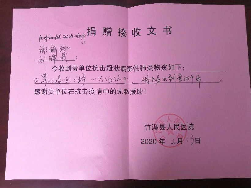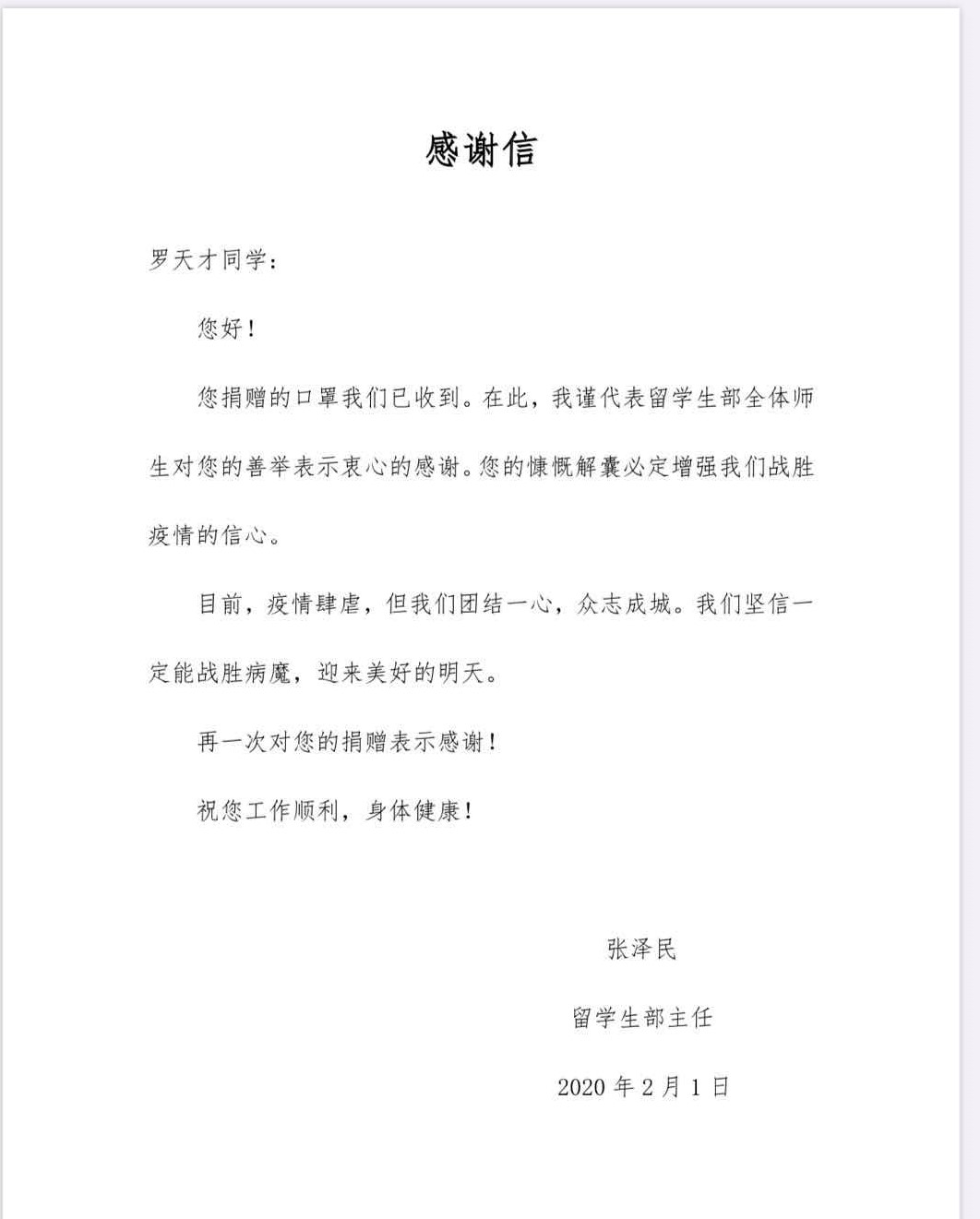 2020年2月1日,我校留学生部收到泰国学生罗天才委托中国朋友转赠的一次性医用口罩500只。就在其后两天内,罗天才通过另外一位中国朋友向重庆的多名需要口罩的同学及朋友赠送了500只口罩。这些口罩的及时送到解决了许多人的燃眉之急。