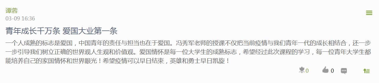 英语学院2019级岳姝彤:此次思政大课中最让我印象深刻的是来自中央财经大学的冯秀军老师的授课。她谈及的中国青年的责任与担当,国家兴亡匹夫有责的责任传承,“苟利国家生死以”的爱国精神接续,正是中华民族生生不息,亘古绵延的精神密码。我们在这场战“疫”大考中认识中国:她有一个以人民为中心、与人民血肉相连的执政党,为人民谋幸福,为民族谋复兴是她的初心和使命;她有具有伟大团结精神的人民,每个人守望相助同舟共济;她有博大的人类命运共同体情怀,我们“生于种花家,何其荣幸”!她有那些心有大我,肩有大任,行有大德的冲锋陷阵奉献自我的榜样们,有勇于担当的青年。我相信,中华民族的力量会更加强大,我们的战“疫”终将胜利。春暖花开时,我们迎接英雄归来!