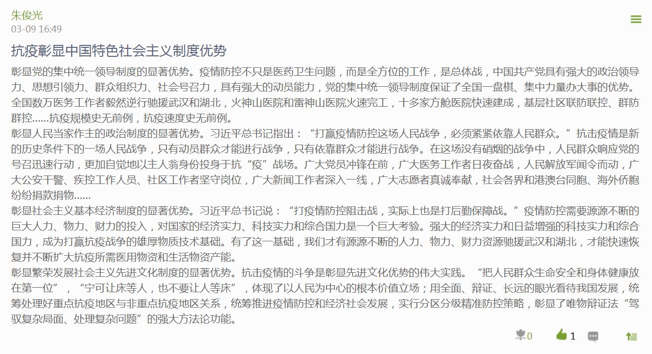 2019级硕士生朱俊光:抗“疫”彰显了中国特色社会主义的制度优势:第一,彰显了党的集中统一领导的显著优势。第二,彰显了人民当家作主的政治制度的显著优势。第三,彰显了社会主义基本经济制度的显著优势。第四,彰显了繁荣发展社会主义先进文化的显著优势。