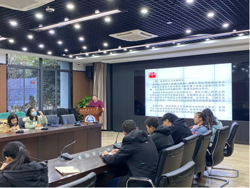 12月4日我国第七个国家宪法日,为深入学习宪法内容、弘扬宪法精神,社会与法学院在立德楼C117教室内开展了主题为“学宪法,讲宪法”的主题座谈会。座谈会由教务处副处长王伟老师主持,社会与法学院党总支书记薛红、法学系教授衡爱民以及部分同学参与了本次活动。