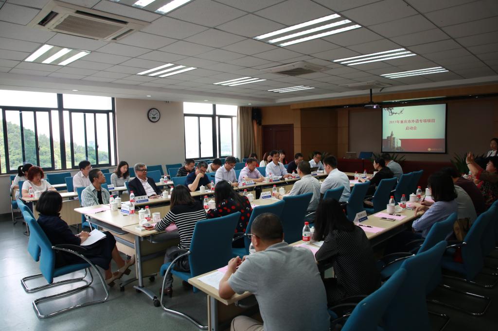 5月23日上午,2017年重庆市外语专项项目启动会在我校行政楼C栋517会议室召开。重庆市社科联党组书记杨清明、副主席阳奎兴、上海外语教学出版社副社长孙玉、四川外国语大学校长李克勇、重庆市社科联兼职副主席王寅和来自西南政法大学、重庆交通大学、重庆邮电大学等15所重庆高校的科研处及外语院系负责人等参加了此次会议。本次会议由阳奎兴主持。