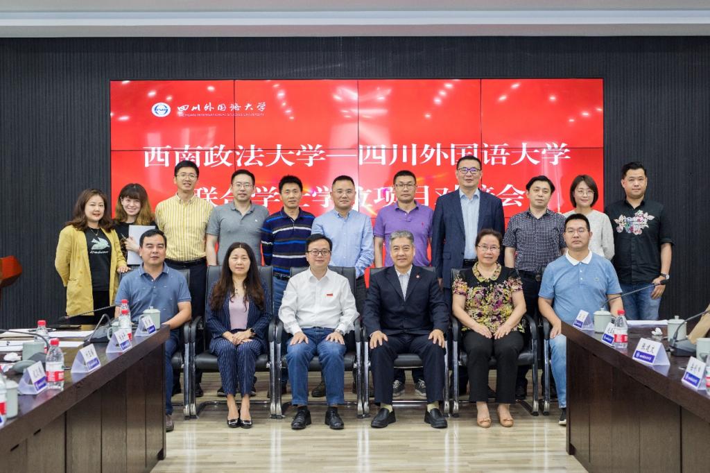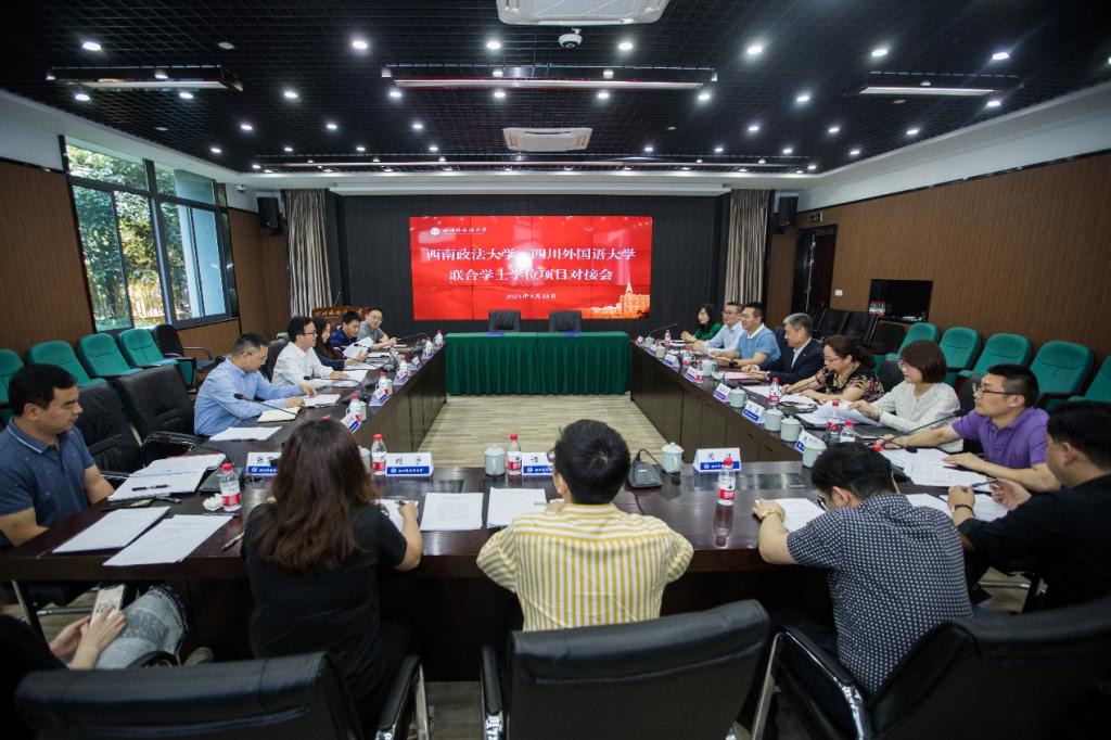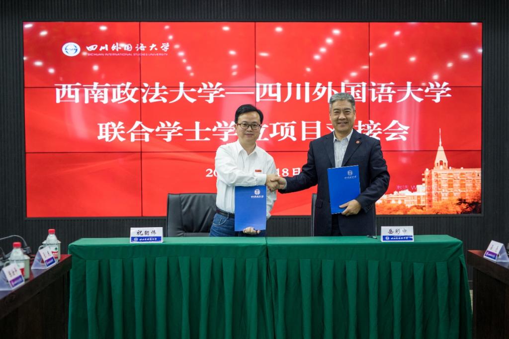 2021年5月18日下午,四川外国语大学和西南政法大学在我校西区立德楼C117会议室就联合培养“一带一路”涉外法治人才签署联合办学协议。西南政法大学党委常委、副校长岳彩申,我校党委常委、副校长祝朝伟,两校教务处、招生部门、培养学院领导出席了会议。会议由我校教务处处长刘玉梅主持。