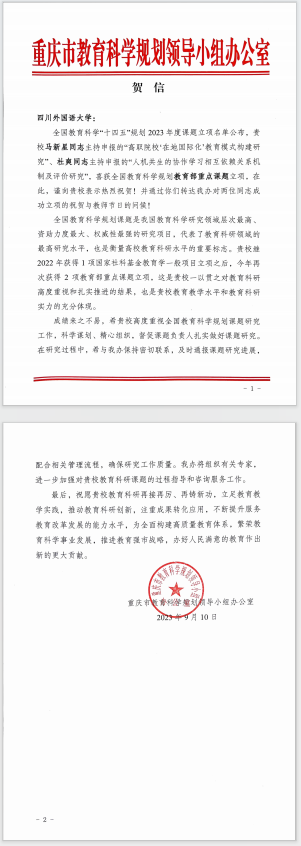 这是我校首次承担教育部教育科学规划重点课题,是我校科研工作又一重大突破。重庆市教育科学规划小组办公室发来贺信,向学校和两位课题负责人表示祝贺。贺信中指出,全国教育科学规划课题是我国教育科学研究领域层次最高、资助力度最大、权威性最强的研究项目,代表了教育科研领域的最高研究水平,也是衡量高校教育科研水平的重要标志。我校继2022年获得1项国家社科基金教育学一般项目立项之后,今年再次获得2项教育部重点课题立项,这是我校一以贯之对教育科研高度重视和扎实推进的结果,也是我校教育教学水平和教育科研实力的充分体现。