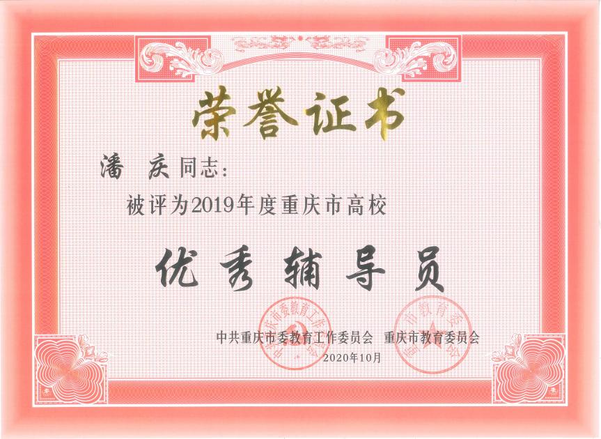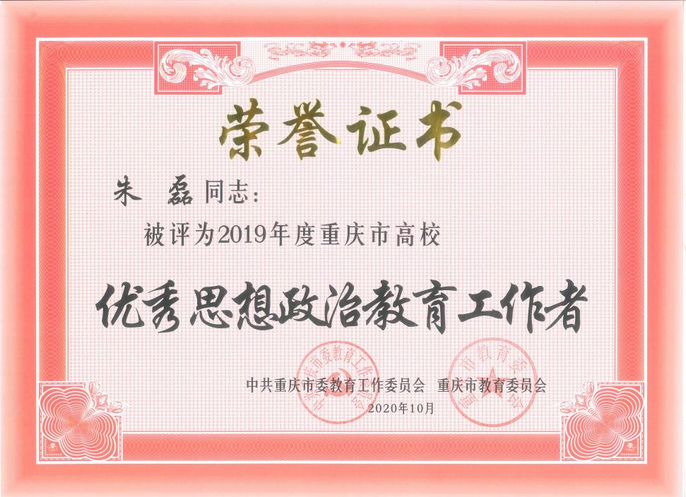 近日,在重庆市高校辅导员工作现场会上,中共重庆市委教育工委、重庆市教育委员会表彰了2019年度高校辅导员年度人物、优秀辅导员和优秀思想政治教育工作者。全市共表彰了10名“高校辅导员年度人物”、20名“优秀辅导员”和20名“优秀思政工作者”。我校学生处思政科朱磊被评为“2019年重庆市高校优秀思想政治工作者”,商务英语学院辅导员潘庆被评为“2019年重庆市优秀辅导员”。