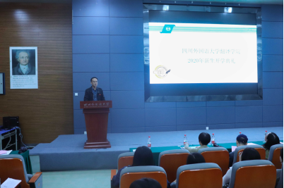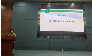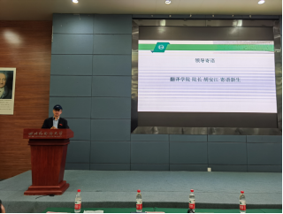院长胡安江在新生寄语中指出,学习和研究是一件需要耐心、恒心去做的事,希望各位新生做好吃苦的准备。他向同学们介绍了学院的发展历史,取得的成绩。通过分享了自己校庆访谈,向新生们提了三点建议。一、爱学习,实现跨专业跨学科学习,以广泛的知识武装自己,以自信的姿态收获光明的未来。高考和考研并非终点,我们的目标在光明的未来,未达到目标,不能疲软也不能松懈,更不能停止学习;二、爱学校,认识到学校是学生们安生立命的物质内核,没有学校,没有学校老师的培养,就没有未来。之后,胡安江院长也简单的提起了川外让他感受最深的三件事;三、爱学院,翻译学院是培育学生们最直接的教学单位,翻译学院的老师们将陪伴同学们度过人生中的最美好的四年,望同学们以身处翻译学院为荣,愿与学院共发展。