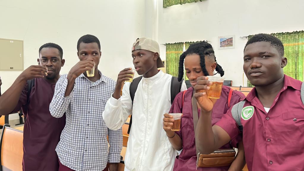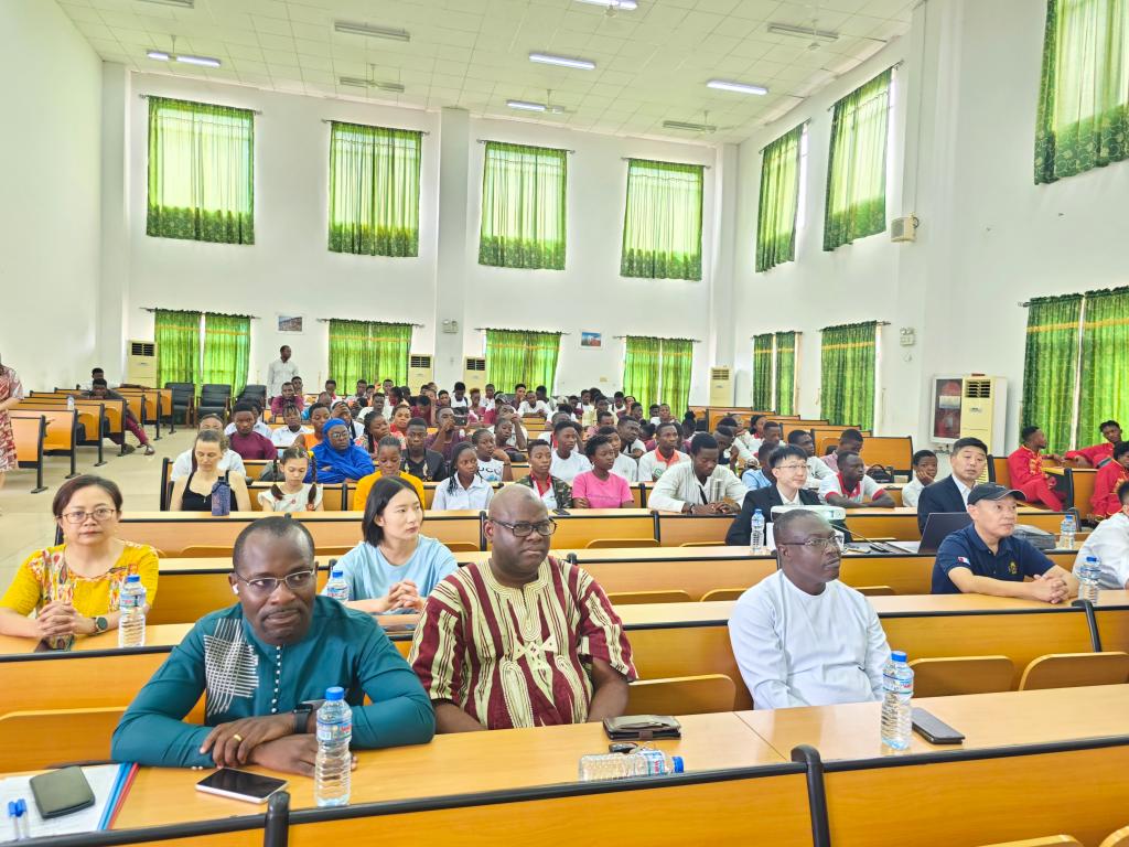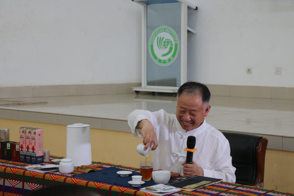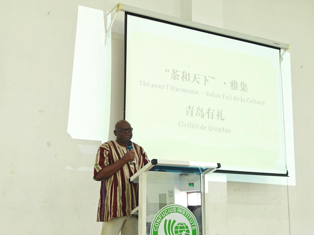 上午场是在孔院礼堂举行的中国茶文化讲解和体验,洛美大学第一副校长巴塔维拉、洛美大学国际处处长茨贝、青岛市文化和旅游局访多代表团、贝宁阿博美卡大学孔子学院中方院长赵华修、洛美大学孔子学院中外方院长朱玉珊、艾布多以及孔院师生共计100余人参加了上午的活动。