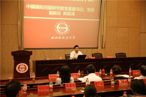 党委副书记,常务副院长阮宗泽作了题为“国际热点与中国新外交”的报告,党委书记明国辉主持报告。报告主要围绕现今国际局势展开,基本涵盖了国际热点问题。阮宗泽在会上重点讲解了在国际格局出现剧烈变化的情况下,中国应该如何处理与其他国家的关系、如何谋求自身发展。在报告中,他将“三严三实”党风建设要求融入国际问题的理解分析之中,联系实际,真正做到内化于心,外化于行,给予在场同志很大启发。在最后的提问环节,针对与会人员对台湾、香港问题提出的疑惑,阮宗泽作了一一回答。