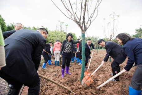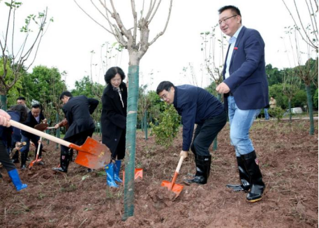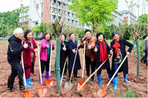 学校领导与校友们,一锄一铲,种植下了一株株萌出点点新绿的樱花树,播撒下了一片片对川外未来发展的美好期望。