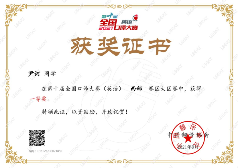 第十届全国口译大赛(英语)重庆赛区复赛及西部大区赛分别于2021年6月、9月在线上顺利举行。经过激烈角逐,翻译学院31名同学分获重庆赛区复赛一、二、三等奖,其中,2020级研究生蒲劲帆、张岷雪同学获重庆赛区复赛一等奖。2020级研究生尹诃同学在由四川、重庆、云南、甘肃、青海、宁夏、广西、新疆、西藏、陕西等十省(市、区)组成的西部大区赛激烈竞争中脱颖而出,荣获西部大区赛一等奖,成功晋级12月份即将在北京举办的全国总决赛。我校在此次大赛中荣获优秀团体奖。