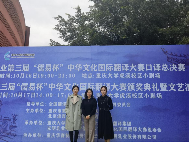 10月16日晚,第三届“儒易杯”中华文化国际翻译大赛在重庆大学虎溪校区小剧场成功举办。经过激烈的角逐,翻译学院2018级本科生王妍妍位列中国学生组第二名,获二等奖。2019级本科生黄稚茹获中国学生组三等奖。