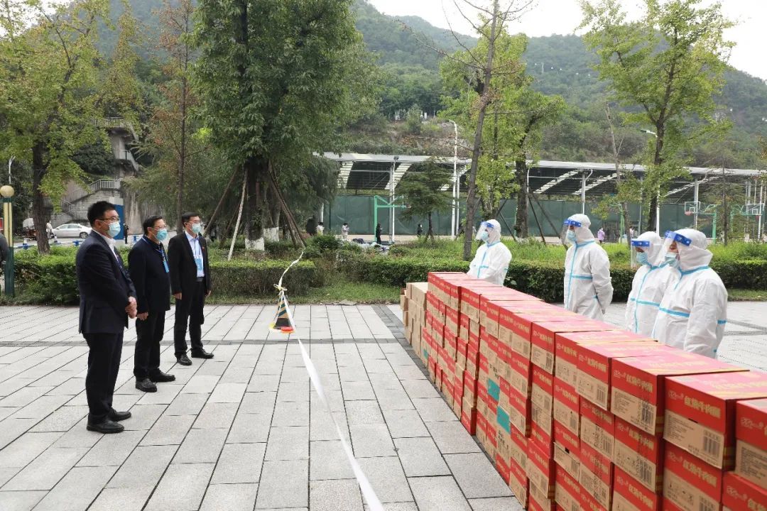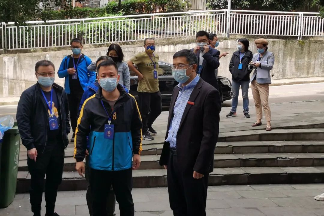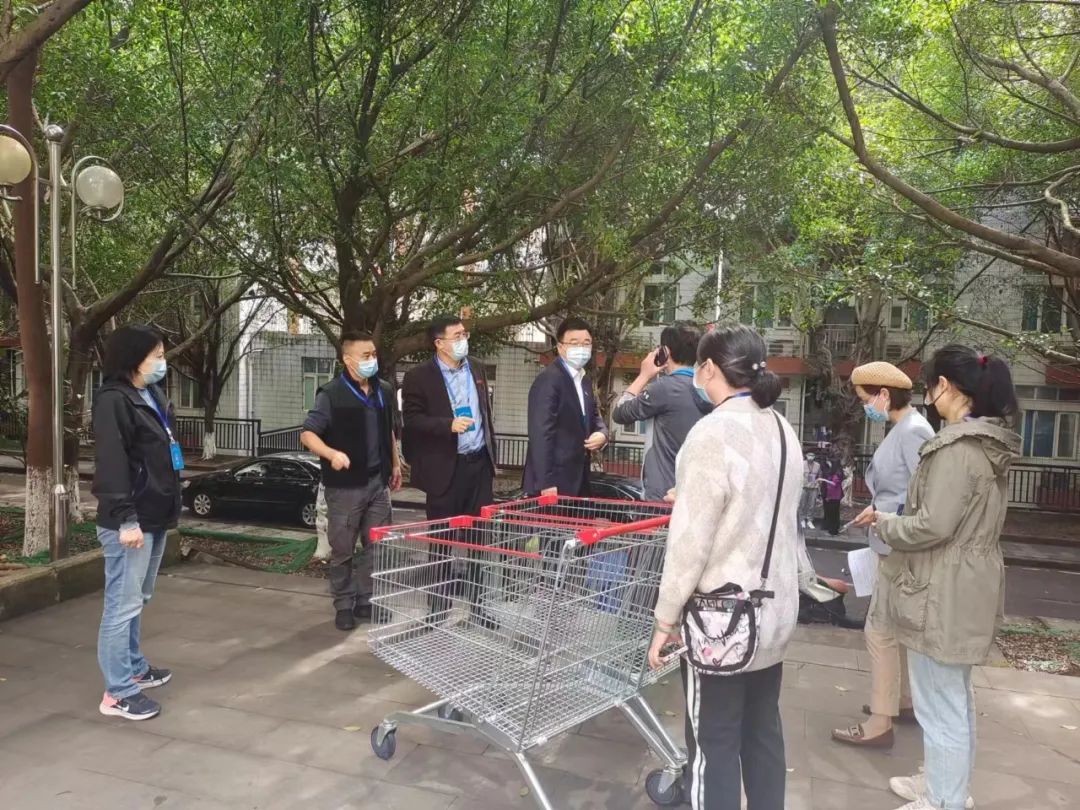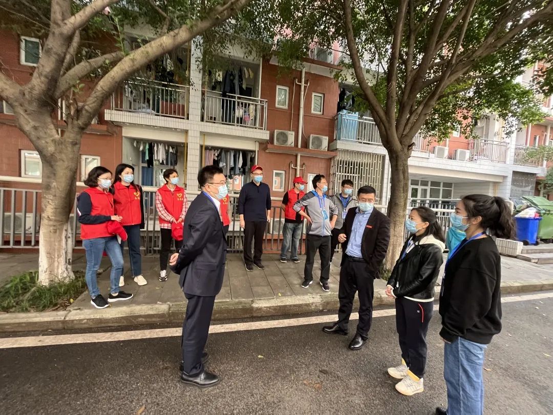上午,校领导还深入疫情处置工作一线,检查核酸检测开展情况和物资供应情况,走访慰问。在商务英语学院学生宿舍楼前,邹渝书记、董洪川校长与正在为学生配送物资的教师党员志愿者亲切交谈,详细了解学生的思想状况、物资保障等情况。