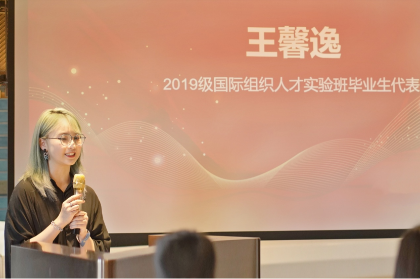 王馨逸代表2019级国组班同学发言,她用英语、西班牙语和汉语三种语言分享了自己在国组班三年的求学感悟,表达了对母校的依依不舍之情和对老师、同学的感激之情,并表示歌乐山将作为母校的象征,伫立在每一位国组班同学的心中。
