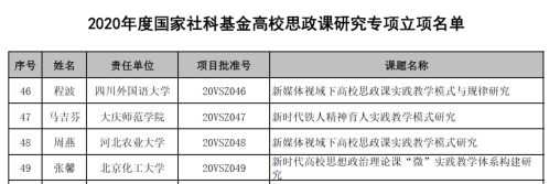 10月20日,全国哲学社会科学工作办公室公布了2020年度国家社科基金高校思政课研究专项立项名单151项,我校马克思主义学院程波老师申报的“新媒体视域下高校思政课实践教学模式与规律研究”成功立项。这是自2019年设立国家社科基金高校思政课研究专项以来,我校获批的第二个项目。
