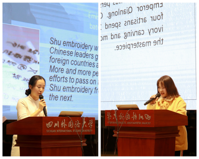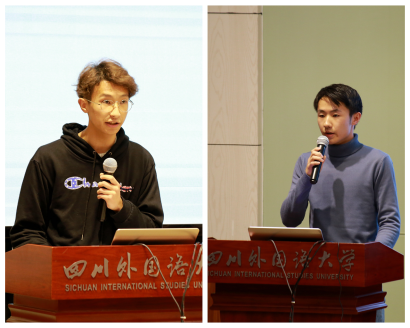 在会上,两个年级的一等奖获奖代表分别展示了获奖的项目作品,并现场分享了项目实施的经验、收获和建议等内容。整个项目的实施以教师为指导,学生为主体,通过小组合作、利用所学英语、结合专业知识、进行项目规划、解决拟定问题、输出项目成果,整个过程充分展示了我校大学英语混合式教学的翻转教学模式。在展示汇报的过程中,观众全神贯注,很多同学均表示深受启发。