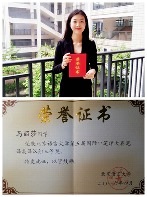 我校学子马丽莎荣获第五届国际口笔译大赛三等奖
