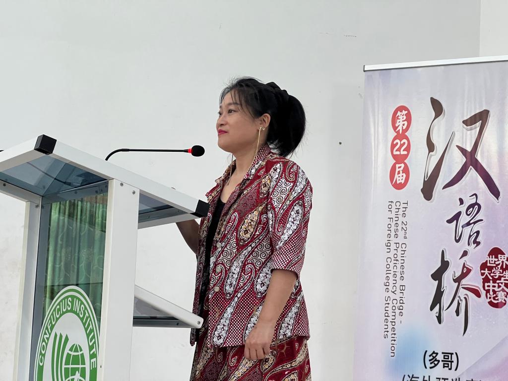 洛美大学孔子学院中方院长朱玉珊致开幕词,并表示时隔三年,汉语桥比赛终于能线下开展,欢迎大家现场感受选手们的风采。朱玉珊祝愿此次决赛选手都能突破自我,赛出风采。
