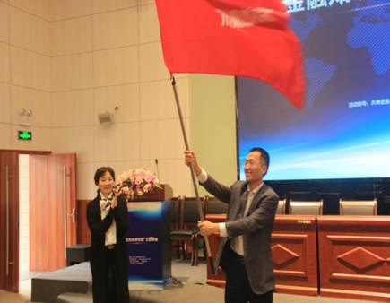 在讲座正式开始之前,重庆广播传媒中心副主任、重庆广电广播传媒有限公司副总经理周洁代表活动主办方为四川外国语大学授旗并发表讲话。