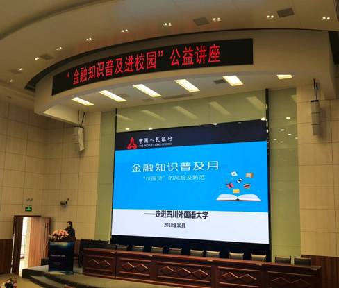 本次讲座分三个板块进行,由人民银行嘉宾何玲枢、重庆银联嘉宾李杰和恒丰银行嘉宾李婷分别开展讲座,为四川外国语大学的同学们进行更为细致的金融知识讲解。首先,何玲枢女士讲解了“校园贷”的风险及防范。她主要从校园典型金融风险、校园金融风险特点及防范和未来移动化趋势三个方面进行阐述。其次,李洁女士从中国银行卡组织及产业以及云闪付等方面出发,讲解了应当如何守护金融安全并建设数字校园。最后,李婷女士讲解了征信方面的知识,并告诉了同学们应当如何维护良好的信用记录。