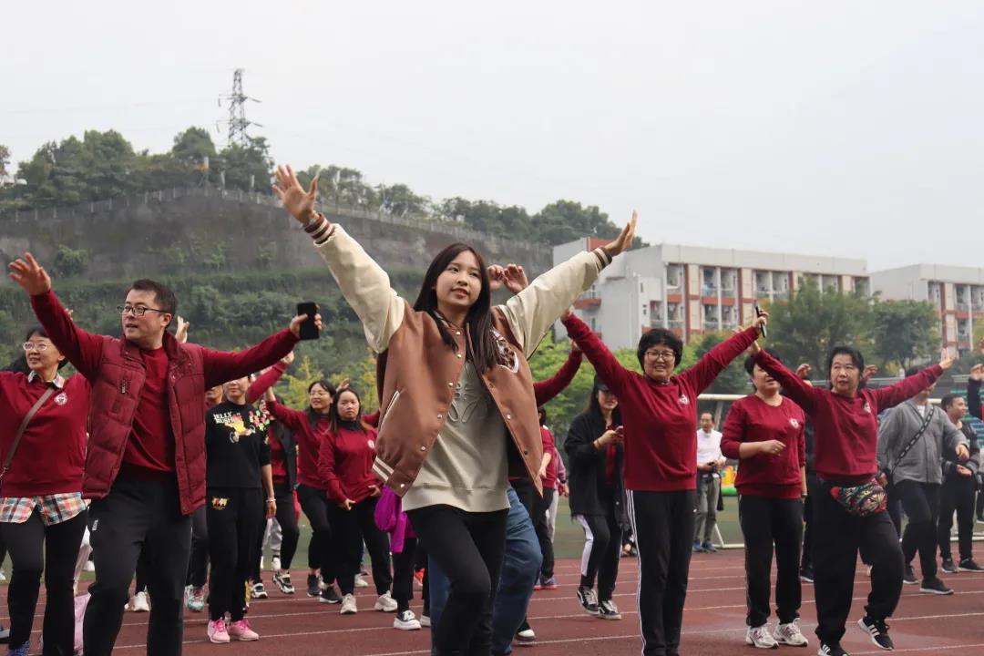 排舞队带领全体教职工跳起澎湃激昂的“热身舞”。伴随着青春洋溢的音乐,教师们挥舞双臂,伸展身体,尽显走下讲台后“另一面”的活力与风采。
