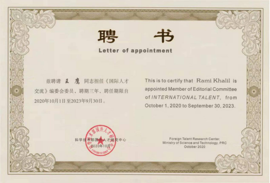王鹰教授(Rami Khalil)受聘书