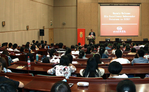 裴德盛先生指出中丹关系的良好发展态势是由双方在政治、经济和外交等诸多方面的相互需求决定的,目前两国关系正朝着一个健康、稳定的趋势发展。由于丹麦在绿色经济、节能环保、科技创新、社会福利等方面独具特色,双方开展互利合作的发展潜力巨大。由于受金融危机的冲击,丹麦经济至今仍未摆脱低迷,中丹关系的良好发展无疑将给丹麦带来更多的经济机会。他的精彩演讲让在场的同学受益匪浅,博得一片又一片的掌声。