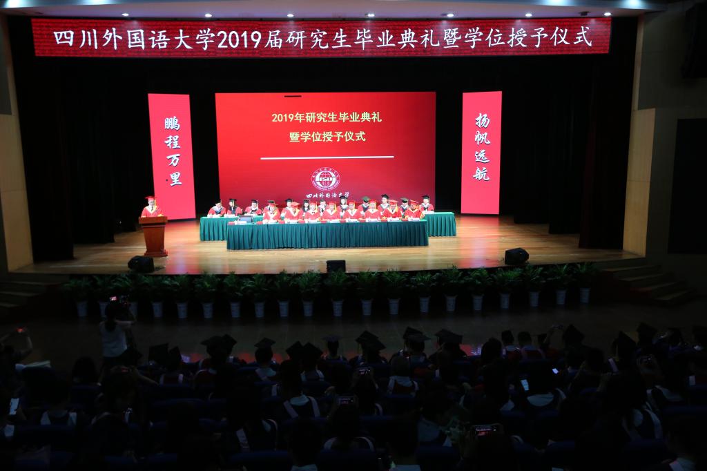 2019年6月24日,四川外国语大学2019届研究生毕业典礼暨学位授予仪式在东区大礼堂隆重举行。党委书记明国辉、校长李克勇、党委副书记张艳、副校长李彦、副校长李小川、副校长董洪川、副校长郑白玲、纪委书记苟欣文、副校长祝朝伟出席本次毕业典礼。另外参加本次典礼的还有各院系党政负责人、学校各职能部门负责人、导师代表、家长代表以及2019年全体毕业研究生及在读研究生代表。典礼由副校长祝朝伟教授主持。