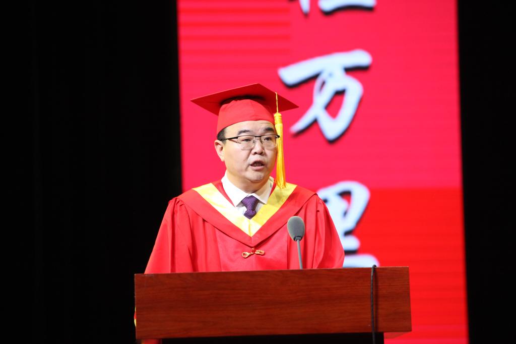 副校长董洪川教授宣读《四川外国语大学关于表彰2019届校级优秀硕士学位论文作者和指导教师的决定》、《中共重庆市委教育工委、重庆市教育委员会关于2019年普通高等教育优秀毕业研究生和优秀大学生的通知》和《四川外国语大学关于表彰2019年优秀毕业研究生的决定》以表达对师生们的肯定与期许。