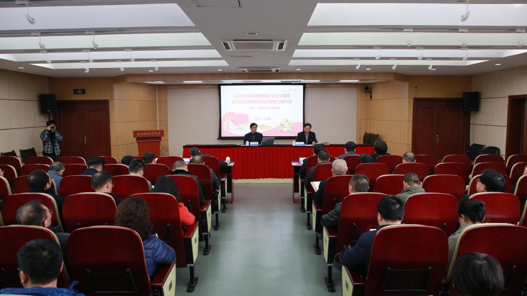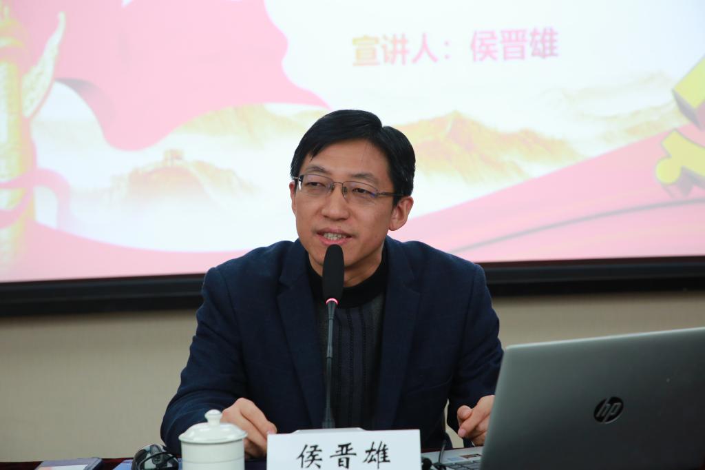 侯晋雄教授介绍了全会的基本情况,回顾了党的十九届三中全会以来的工作,并从时机、主题、影响三个方面对十九届四中全会的历史地位作了介绍。紧接着,他强调了充分认识坚持和完善中国特色社会主义制度、推进国家治理体系和治理能力现代化的重要意义。结合党的光辉历史和学习体会,他重点阐释了我国国家制度和国家治理体系具有十三个方面的显著优势,以及坚定中国特色社会主义制度自信的要求。他详细介绍了会议审议通过的《中共中央关于坚持和完善中国特色社会主义制度、推进国家治理体系和治理能力现代化若干重大问题的决定》提出的总体要求、总体目标和重点任务,并对《决定》的起草与主体结构进行解析。