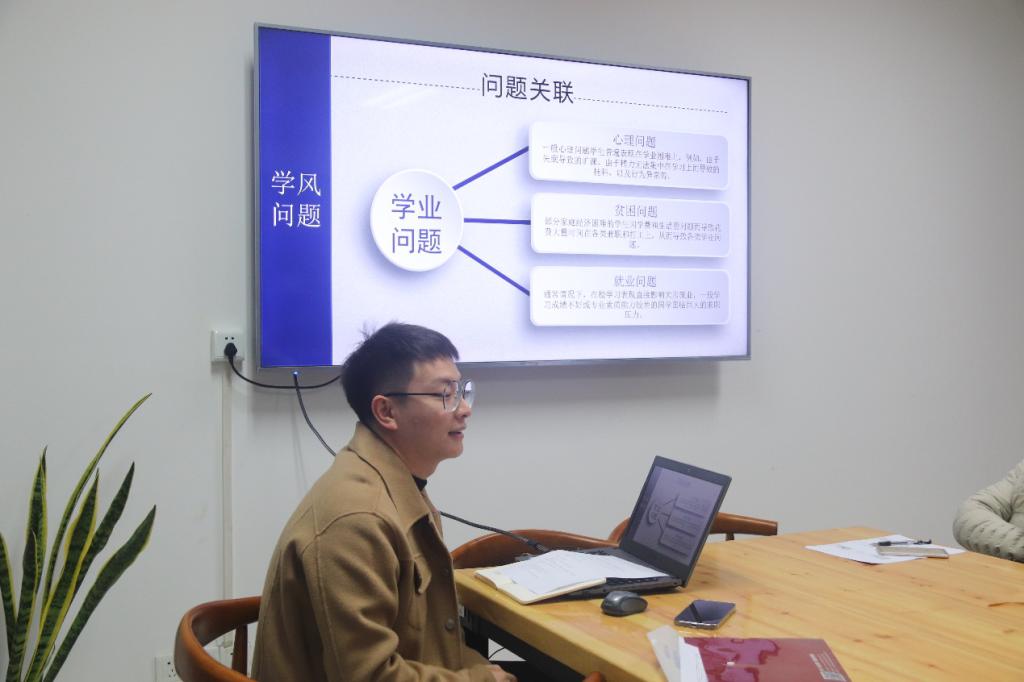 第九期辅导员沙龙活动的主题是“新时代高校学风建设”,由国际商学院2020级辅导员陈力行主讲。他首先从大学生学风建设的现状出发,提出大学生主要存在学习内动力不足、自控力差等问题。他从社会、学校、学生三个层面分析产生学风问题的原因,提出应该从内外驱动力的角度解决学风问题,内驱动力方面主要涉及到增强专业认同感、提高知识渴求度、加强人生发展规划、实现自我价值等;外驱动力主要涉及到营造学习氛围、发挥榜样带动效应、增加各方面奖励政策等。他也提出新闻传播学院的“卓越班”和“读书报告会”、国际商学院的“创新创业培育项目”等优秀学风建设项目可供参考。商务英语学院2019级辅导员潘庆提到,学风问题应该分析深层次的原因,并针对不同专业的特殊性采取不同的措施,比如语言类的专业应该加强早读督促制度。