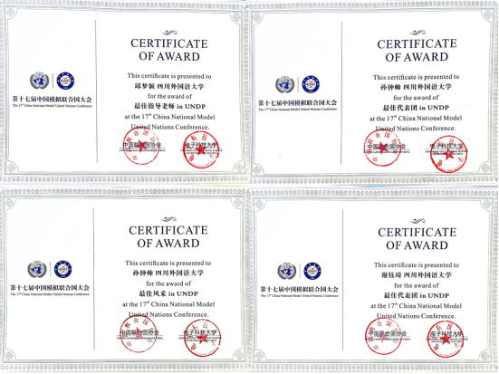 我校指导教师团队在会前、会中、会后,对四位参会代表就学术调研、文件写作、演讲与辩论技巧、学术规范等方面都提供了细致的专业指导。经过四天的激烈角逐,我校谢钰琦、孙钟帅两位同学被评为“最佳代表团 ”(Best Delegation),孙钟帅同学同时荣获“最佳风采奖”,带队指导老师邱梦颖被授予“最佳指导老师”称号。