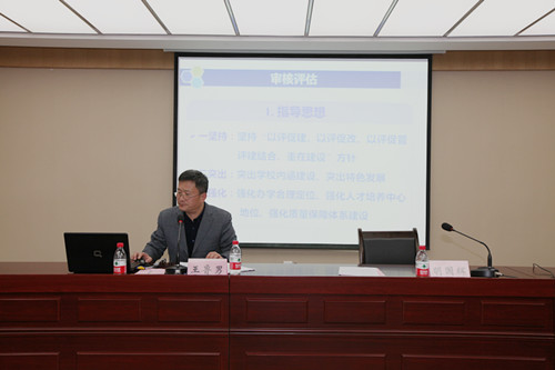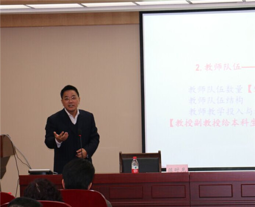 随后,王鲁男副校长以“深入学习,摸清家底,扎实推进迎评促建”为题,解读了审核评估与专业评估的区别、分析了我校迎评促建面临的突出问题、并就我校迎评促建的近期任务与要求提出了具体的设想。他结合我校基本状态数据和质量年报核心数据,通过对照教育部基本办学合格标准以及重庆市数据平均值,重点从学校和院系两个层面分析了我校在教师队伍、教学资源、培养过程等方面存在的突出问题,并就学校的评建工作提出建议和要求。他强调,我校将于今年开展的专业评估,属于教育部“五位一体”评估体系中的“自我评估”,是学校摸清家底,建立内部质量保障体系的重要内容。通过专业评估,将深入查找各专业在本科人才培养方面存在的问题和薄弱环节,深刻剖析各专业存在的不利于人才培养质量提高的制约因素,推进专业结构调整与优化,提高我校的本科教学水平和人才培养质量。他指出,学校各级领导干部和全校师生要充分认识到审核评建工作的重要意义,认真学习、深入理解,明确审核评估的工作思路和工作进度,落实责任,在迎评促建工作中积极发挥主观能动性,淡化功利色彩,注重内涵建设,自觉投身评建各项工作,确保评建工作任务重实效、出成绩,推动我校的整体办学实力和人才培养质量再上新台阶。