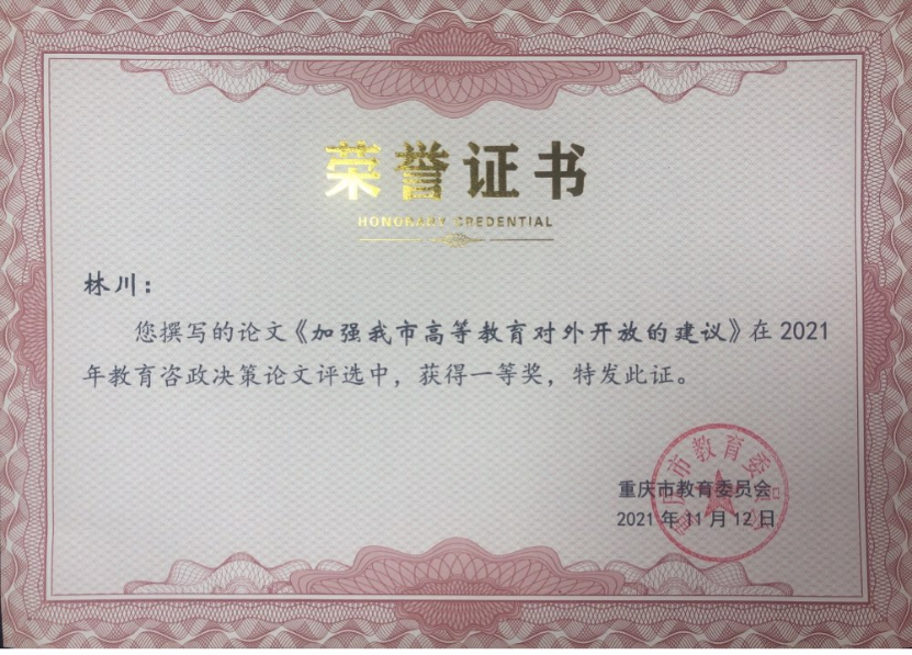 日前,重庆市教委公布2021年教育咨询决策论文评选结果,国际金融与贸易学院林川教授撰写的《加强我市高等教育对外开放的建议》荣获一等奖。