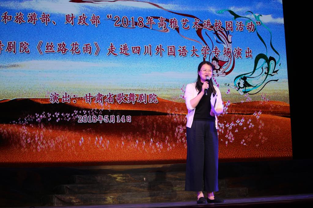 演出开始前,张季菁副校长致辞并表达了对甘肃省歌舞剧院的热烈欢迎与诚挚感谢,同时代表川外与甘肃省歌舞剧院艺术总监张稷老师互赠礼物,祝愿川外与甘肃省歌舞剧院友谊地久天长。