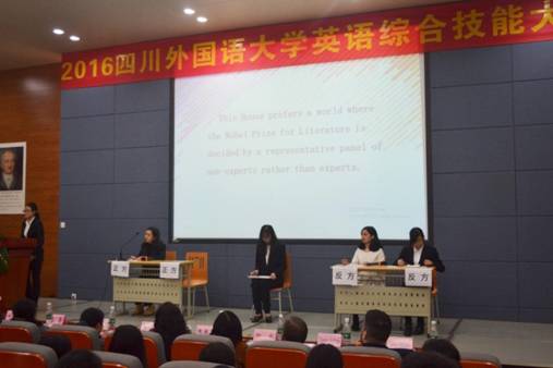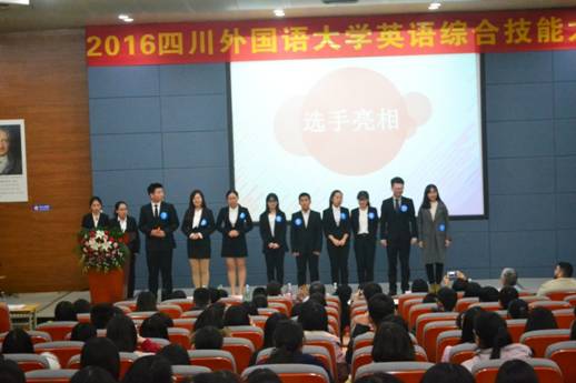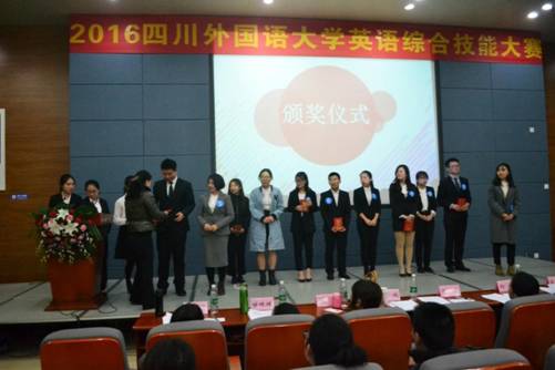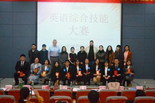 2016年11月29日晚7点,四川外国语大学英语综合技能大赛在西区教学楼A栋报告厅拉开帷幕。我校副校长王鲁男、教务处副处长陈汝平、翻译学院党总支副书记郭健、翻译学院副院长胡安江、教务处实践教学管理科老师徐陶受邀出席现场。陶曦、张鹏、向容、黄钰洁、甘姝姝、朱菊芹及外教Pablo Serrano、John Glasheen、Timothy Hoffman担任大赛评委。