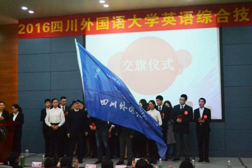 大赛最后,翻译学院副院长胡安江、教务处副处长陈汝平、商务英语学院副院长胡文飞共同参与了接旗仪式,2017年四川外国语大学英语综合技能大赛将由商务英语学院承办。至此,2016年四川外国语大学英语综合技能大赛圆满落下帷幕。