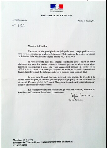 2014年6月4日,法国驻华大使白林女士致信我校。信中说,为表彰李克勇校长长期致力于教授、推动和传播法国语言文化等方面所做的贡献,法兰西共和国总统于2014年4月28日签署总统令,授予他 “法兰西国家功勋军官勋章”。法国驻华大使白林女士及法国驻成都总领事将于下半年到重庆为李校长授勋。