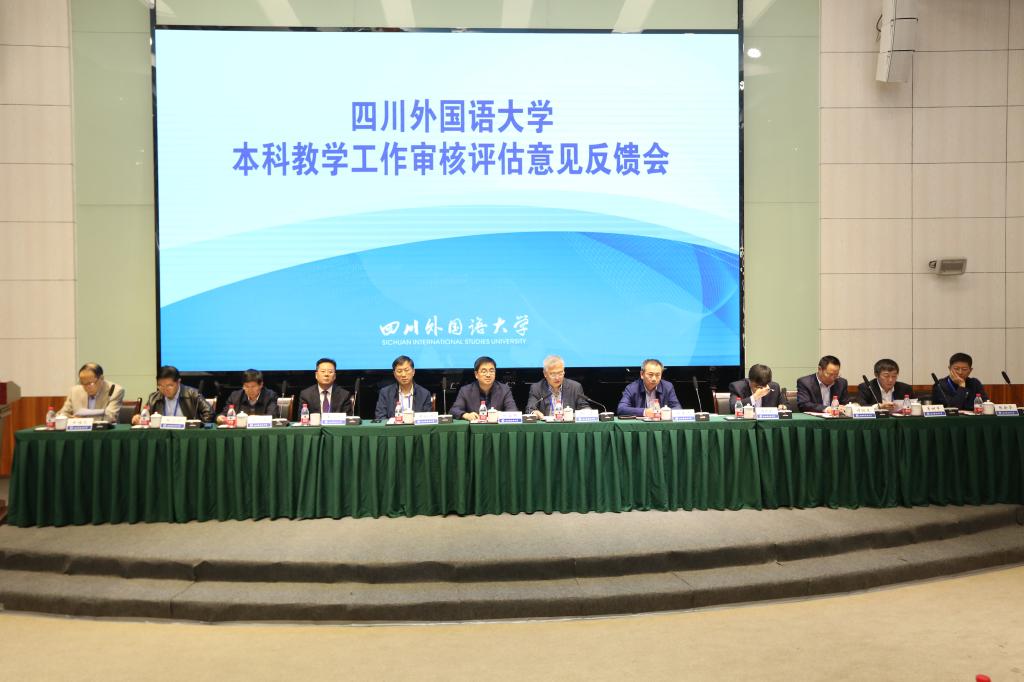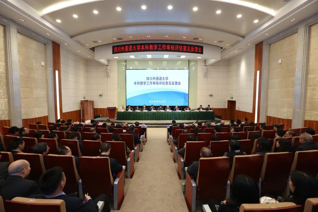 10月18日下午,四川外国语大学本科教学工作审核评估专家意见反馈会在学校宏文楼国际报告厅召开。审核评估专家组全体成员,重庆市教委副主任刘宴兵、发展规划处处长姚友明,高教处处长蒋后强、学生处处长奚弟超、高教处正处级调研员闵权、人事处正处级调研员牟大志,重庆市教育评估院副书记、副院长张东,全体校领导,职能部门负责人及教学单位党政负责人,教师代表出席反馈会。反馈会由专家组组长、北京外国语大学原党委书记韩震主持。