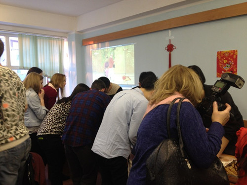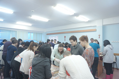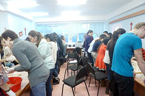 下午2点,在中方院长的组织下,来自川外的孔子学院志愿者们开始布置活动现场——挂中国结和福字、贴春联和年画、准备节庆音乐和春晚视频的播放,整个教室充满了过“中国年”的喜庆气氛。4点左右,俄罗斯客人们陆续到来,他们和志愿者们愉快地交谈,一边饶有兴味地看春晚节目,一边讨论中国的新年礼俗和文化。随后,在志愿者们的示范和讲解下,俄罗斯人开始学习包中国饺子。“学生们”学得认真、问得细致,不一会儿,有的学会了熟练地擀皮,有的掌握了中国饺子的几种常见包法,有的甚至能轻松地包出各种不同样式的饺子。虽然饺子的形状各异,有的成了包子或汤圆,有的甚至没有成形,但这丝毫不影响俄罗斯人的学习热情和干劲,反倒为本就其乐融融的教室增添了一份别样的乐趣。