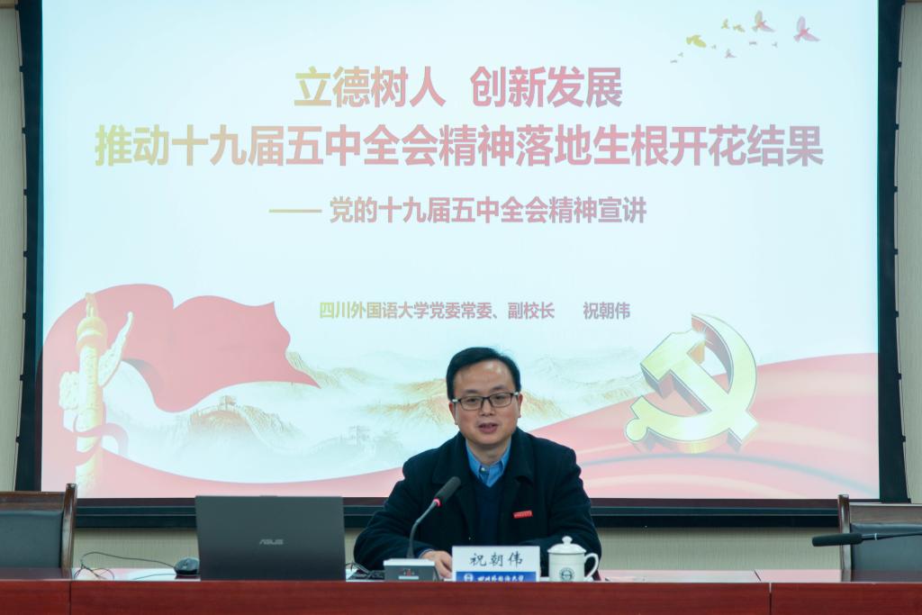 12月10日,副校长祝朝伟宣讲党的十九届五中全会精神。教务处、质量监测与评估中心、科研处、信息化管理办公室(教育技术中心、实验室管理中心),省级人文社科研究基地教职工参加宣讲会。