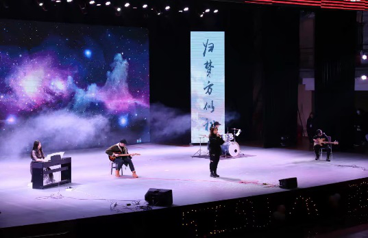 19:00,“提比达波寻梦记”元旦晚会正式开始,全场观众跟随主持人一起,步步攀登提比达波山,领略西班牙独特的浪漫风情。晚会上,歌唱节目婉转动人,引得观众深深陶醉;小品节目妙趣横生,师生爆笑不停;热辣劲舞嗨翻全场,气氛热闹非凡。演员在台上发光发亮,每个节目都熠熠生辉,同时,工作人员也在幕后一丝不苟,确保整场晚会的顺利进行。