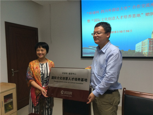 与会嘉宾还就合作方式和合作内容进行了热烈讨论。石丁向我校翻译学院赠发了“国际文化创意人才培养基地”牌。