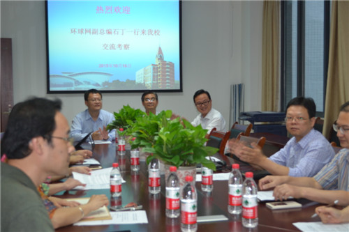 学校办学思路及未来发展动向。他指出,高等学校的人才培养必须服务区域经济发展和国家战略需求,因此学校的人才培养需要企业的支持,企业的发展也需要学校的智力与人力支持。学生要用所学的知识与技能服务区域经济与社会的发展,发挥主观能动性,回馈社会。教师要通过学生的学习与实践不断提高教学和科研质量,改进教学效果,才能培养出适应社会需求的人才,促进学校的长远发展。在学校“双创”活动中,加强学校与企业的合作能够为学生提供良好的平台。他希望环球网能进一步加强与我校各相关院系的合作,实现学校与企业的互利双赢。