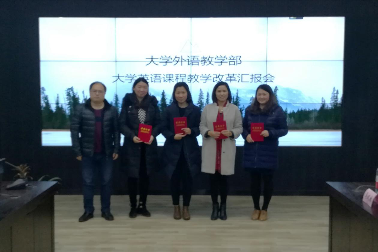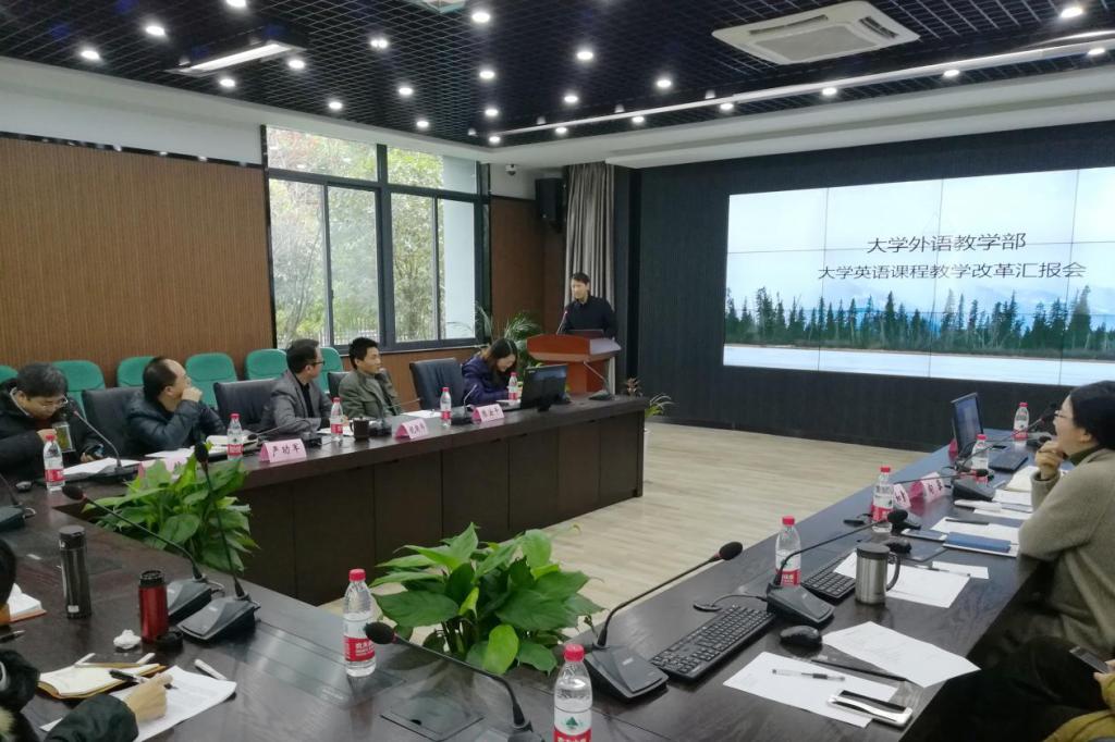 2017年12月22日下午,大学外语教学部在东区行政楼C-117室召开了大学英语课程教学改革汇报会。参加会议的有四川外国语大学副校长祝朝伟、教务处处长严功军、副处长王伟、副处长陈汝平及大外部、教育学院全体教师。会议由大外部副主任向蓉主持。