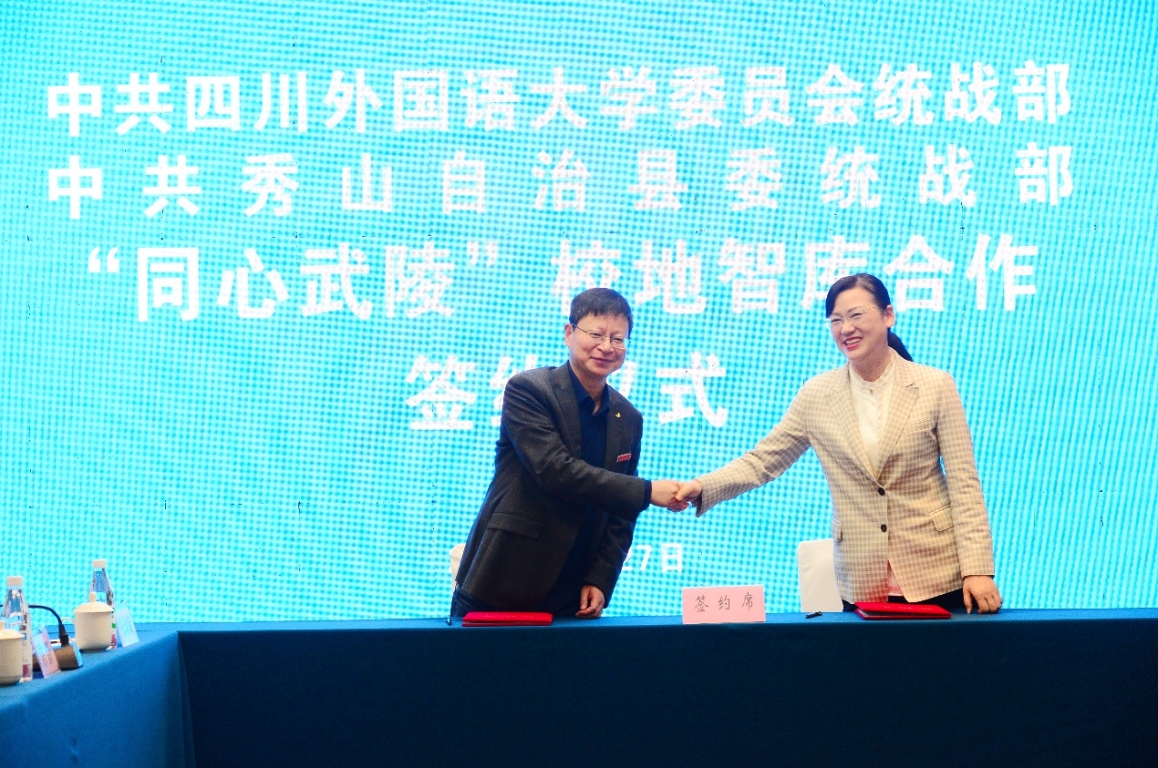 在听取秀山县领导介绍秀山经济社会发展及非遗文化传承与保护后,苟朝莉代表学校向与会领导和嘉宾介绍了川外在学科专业建设、国际化特色办学、高端智库打造等方面的综合情况,特别是学校依托国际化特色高校建设在涉外服务和咨政建言领域取得的重要成绩。她强调,在川外定点帮扶秀山乡村振兴的大背景下,学校积极支持和促成双方围绕非遗文化和智库建设拓展合作维度,强化合作效用,提升合作质量,既有助于推动秀山经济社会进一步快速发展,又有利于学校借助社会资源反哺教学科研,为师生学以致用,履行社会责任提供更大平台,实属一件合作共赢的好事情。为更好地发挥校地双方各自的比较优势,学校党委统战部还与秀山县委统战部签订了“同心武陵”智库建设合作协议,标志着双方的实质性深度合作迈上一个新台阶。