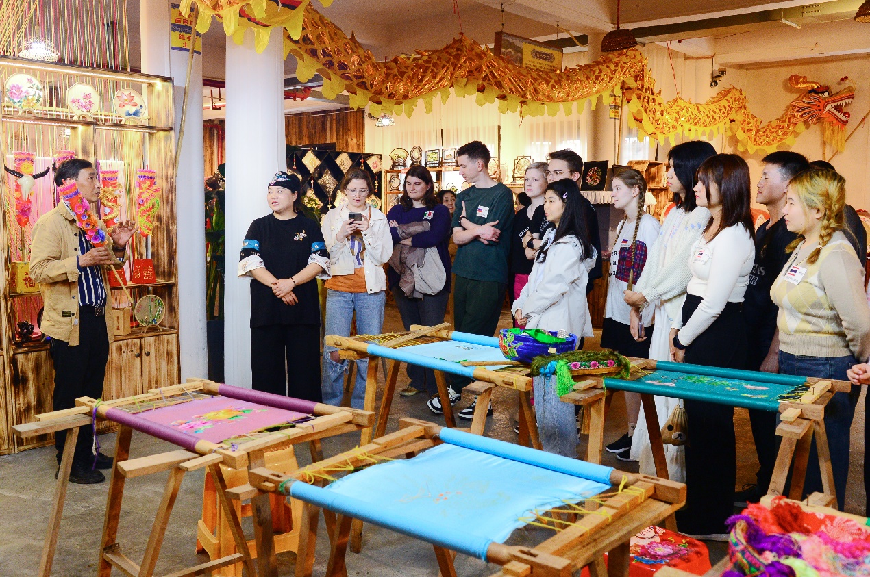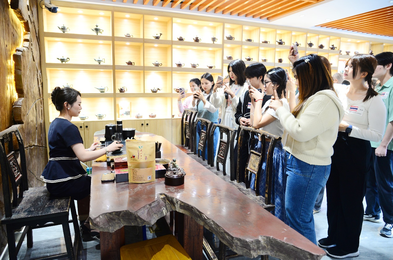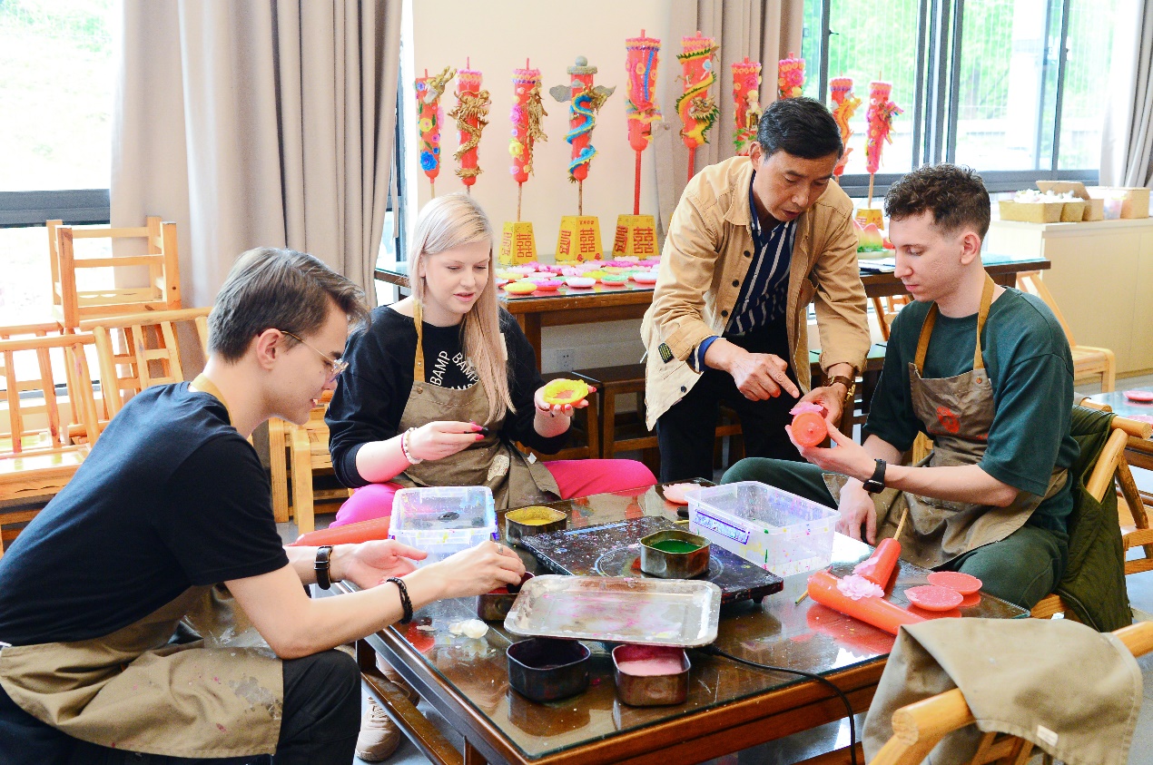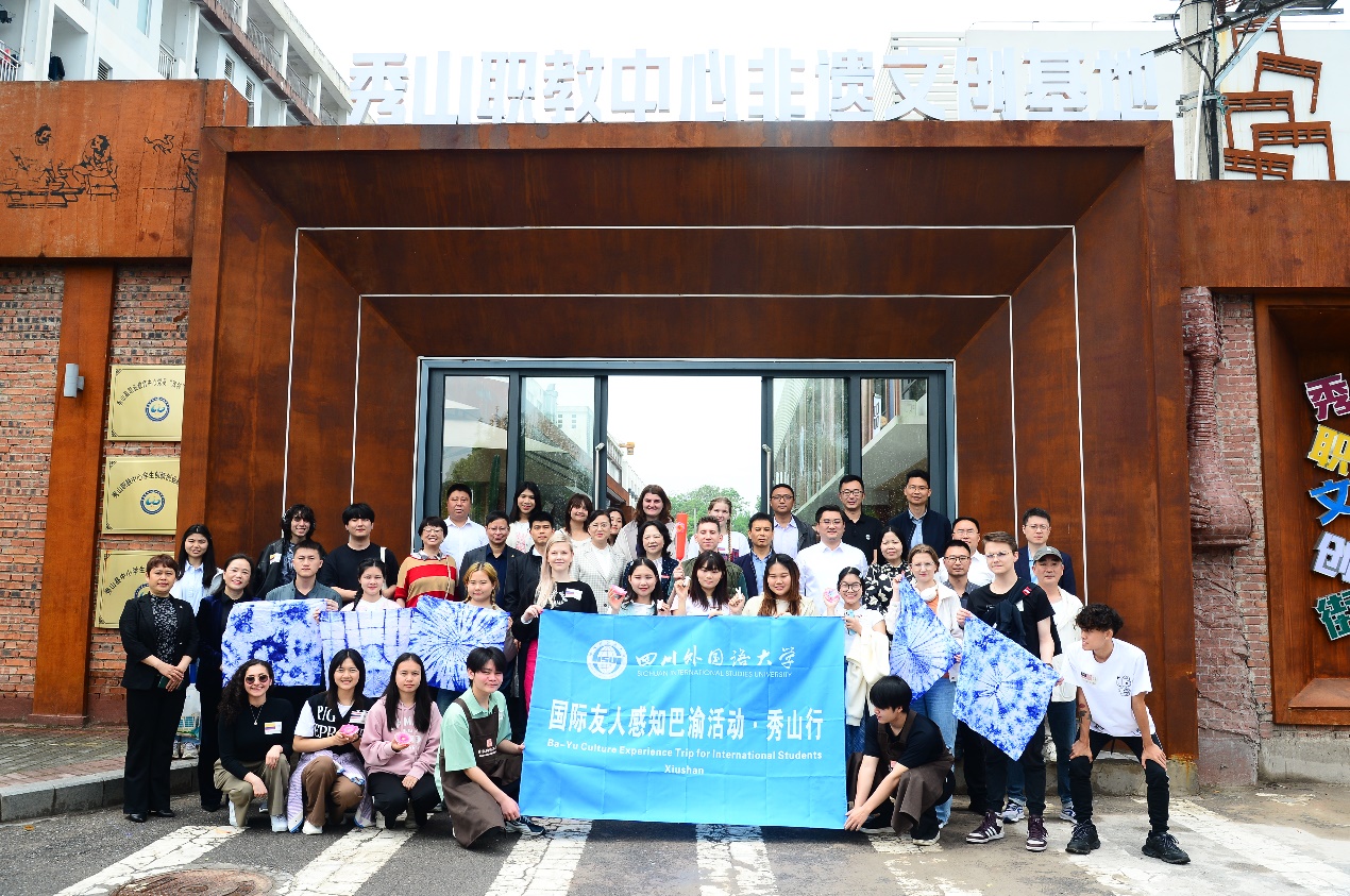 随后,苟朝莉一行在秀山县职教中心参加了四川外国语大学非遗文化实践基地授牌仪式。同行的25名国际学生在职教中心领导的指引下,详细了解了非遗文创基地的建设历程并亲身体验了金珠苗绣、陶艺制作、土家扎染等非遗文化。在秀山期间,国际学生还应邀参观了武陵风文化艺术有限公司,首次接触了秀山独有的紫砂石壶非物质文化遗产,对非遗传承人惊艳的手工技艺赞不绝口,纷纷表示再次感受到了中华优秀传统文化的伟大与宝贵。学生们还受邀游览了秀山县市级旅游度假区川河盖,实地体验了生态文明建设和乡村生态振兴的巨大成就。他们希望学校以后组织更多类似的特色体验活动,也愿意通过各种方式向世界推介更加真实、立体、全面的中国。