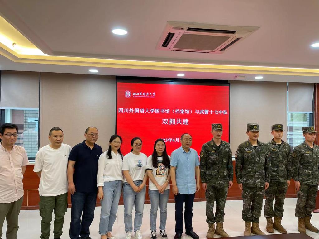 为深入学习贯彻党的二十大精神,全面推进高校图书馆“全民阅读”工作,提升官兵文化素养,4月21日,四川外国语大学图书馆(档案馆)与武警十七中队开展了军民融合共建“书香军营”活动。本次活动在图书馆505会议室举行,图书馆(档案馆)馆长杨俊主持活动,武警执勤五大队副指导员肖华、武警十七中队指导员周阳阳、图书馆各部室主任等参与本次活动。双方本着充分发挥各自优势、共建共享、互帮互助原则,结为“双拥共建单位”。