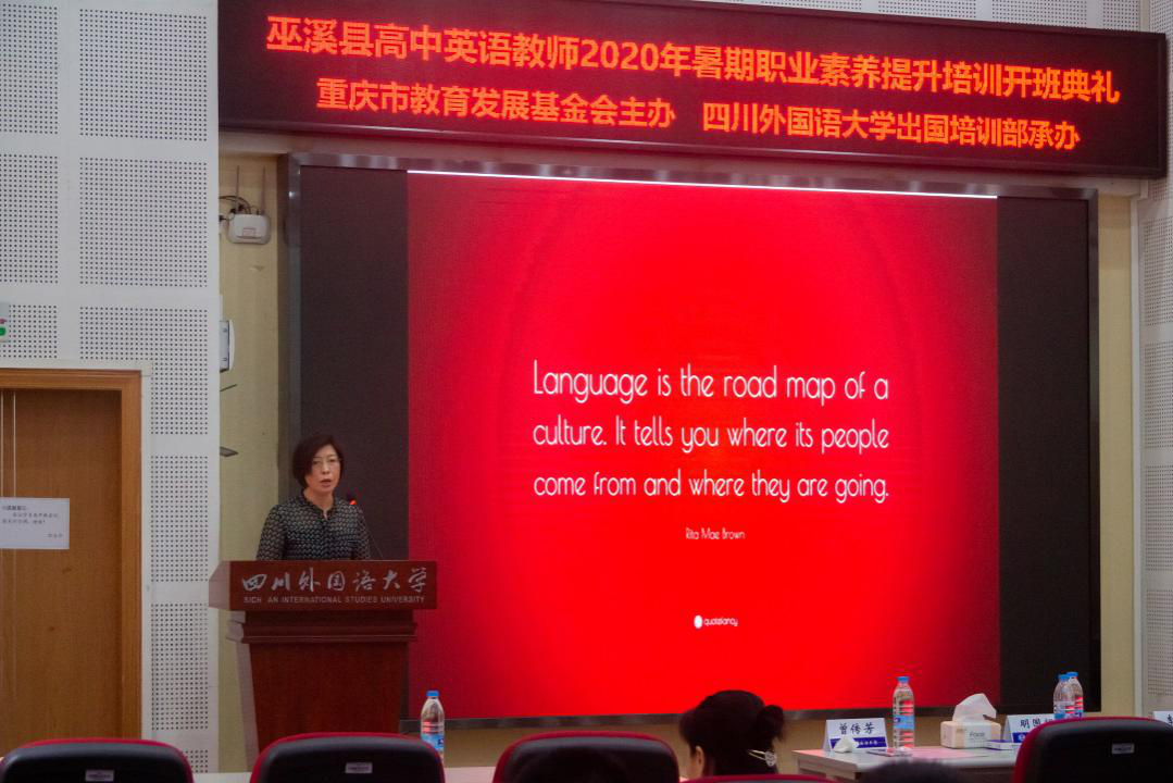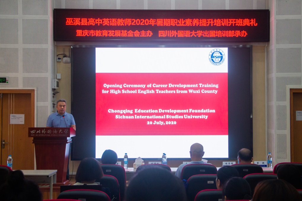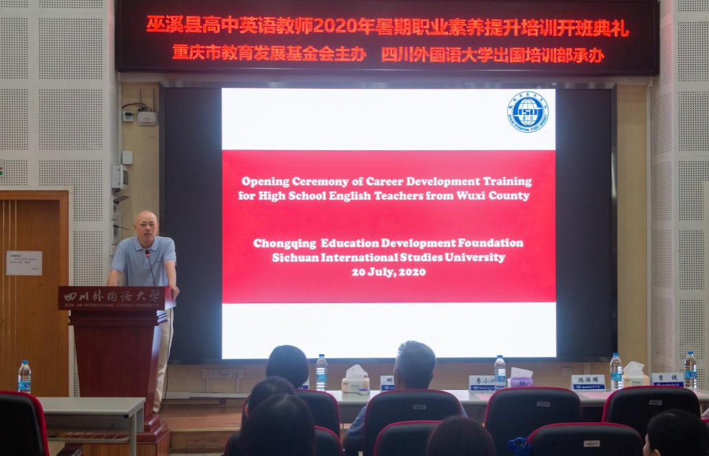 2020年7月20日,巫溪县高中英语教师暑期职业素养提升培训在四川外国语大学顺利开班。重庆市教育发展基金会理事长明国辉、项目部部长陈源国、四川外国语大学副校长李小川、四川外国语大学后勤集团党总支书记曾健、出国培训部党总支书记杨晓东、主任曾传芳、副主任张勇出席开班典礼。