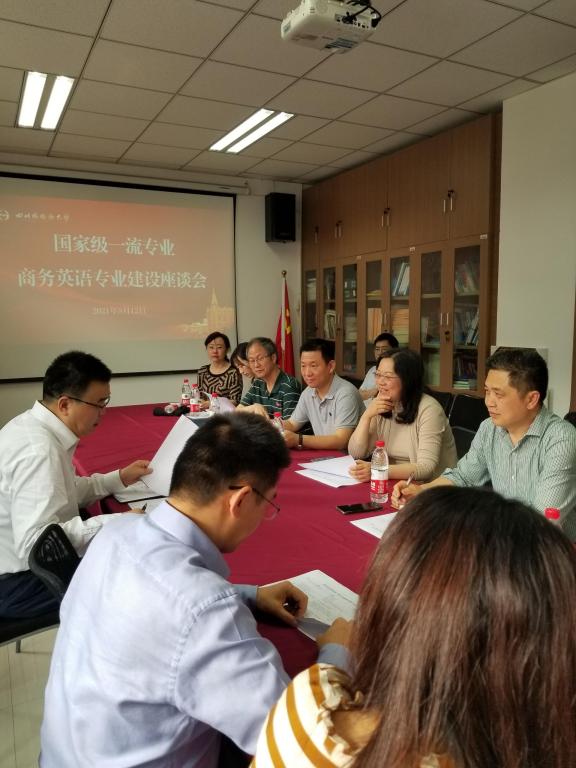 2021年5月12日下午,国家级一流专业商务英语专业建设座谈会在商务英语学院会议室举行。参加会议的有国家级一流专业商务英语专业负责人、校长董洪川,商务英语学院院长段玲琍、党总支副书记常慧明、副院长顾金成、黄绍胜及商务英语学院各教研室主任、所有教授及博士。会议由商务英语学院院长段玲琍主持。